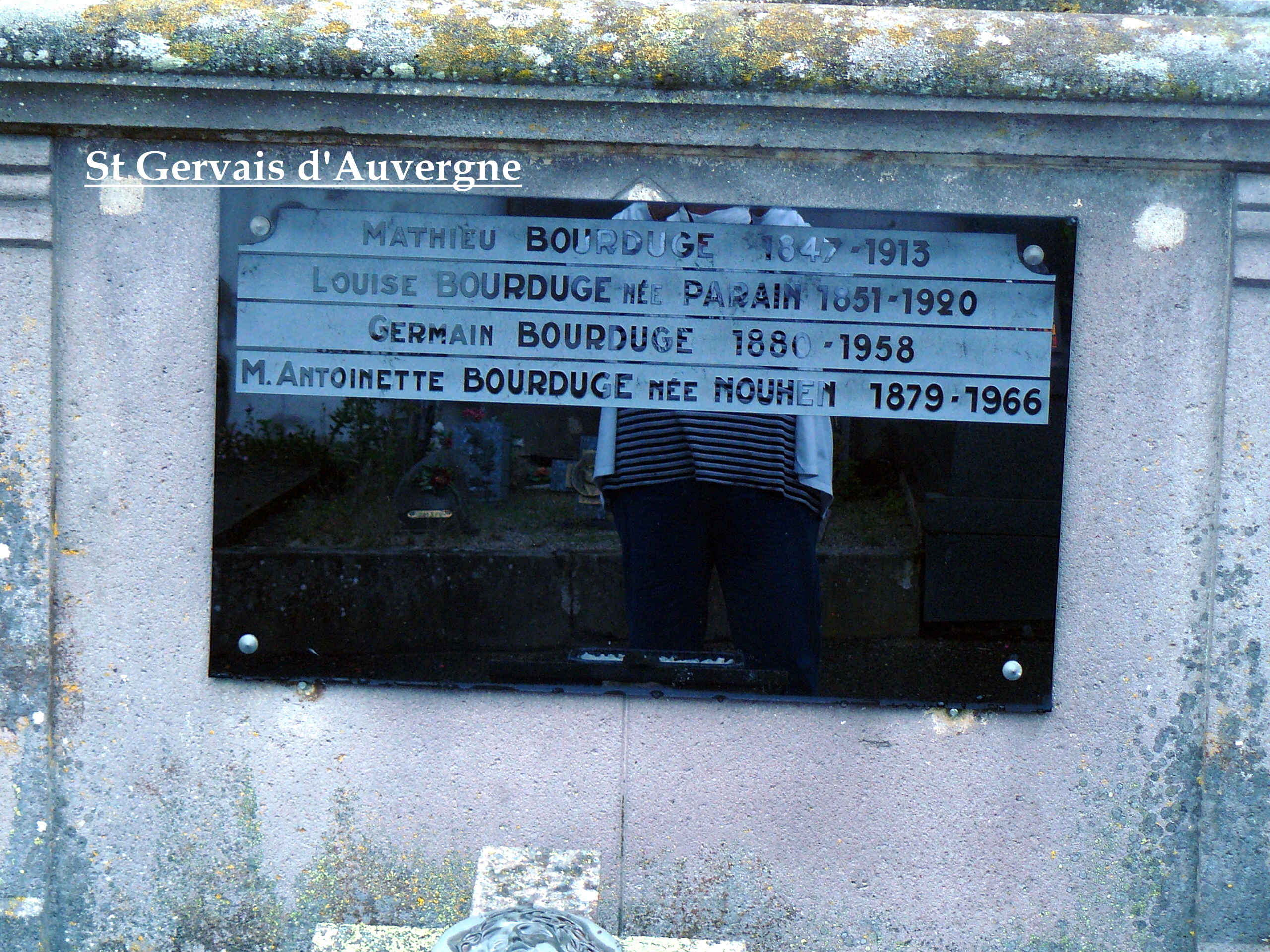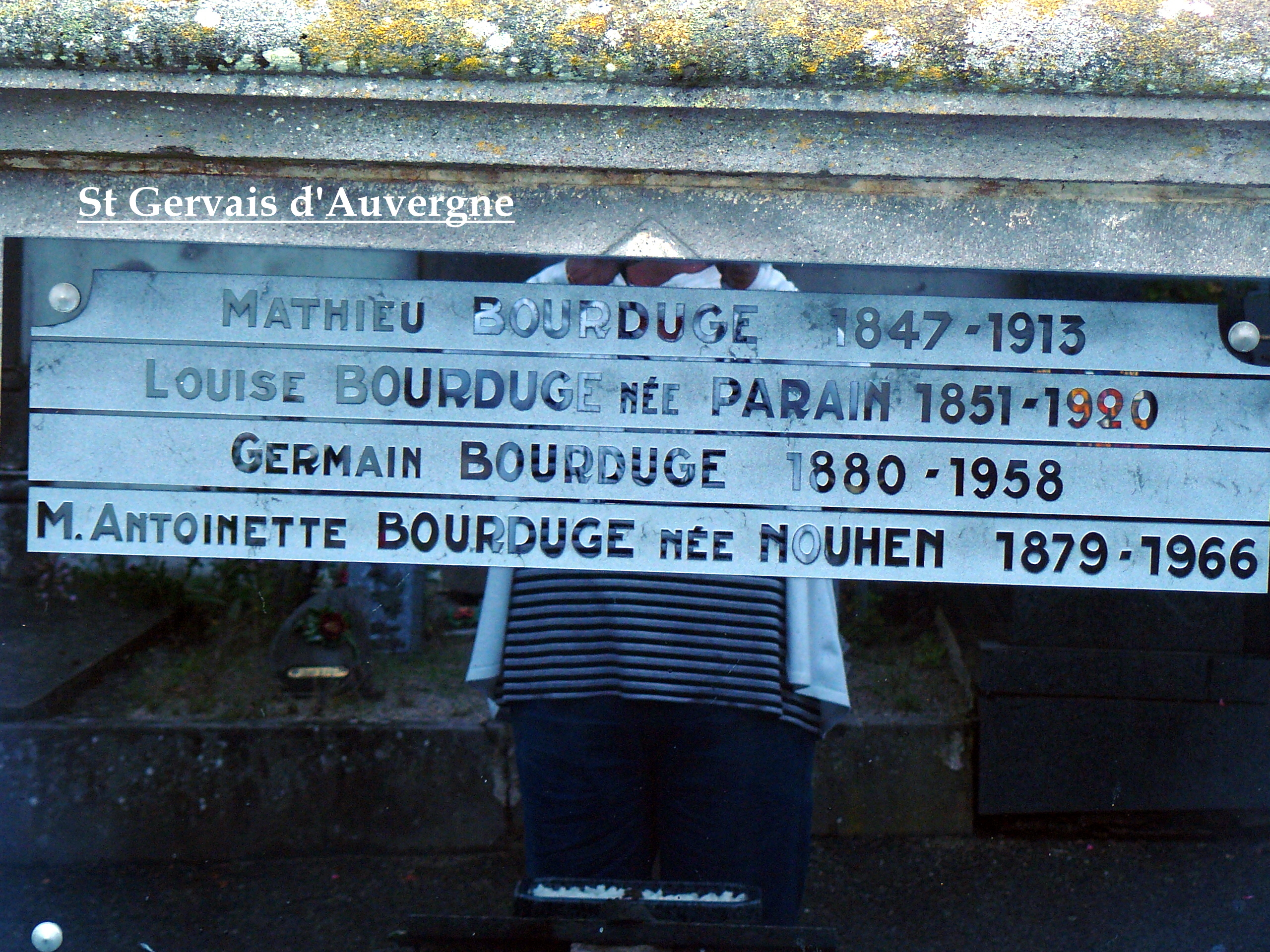 Gervais d'Auvergne Enterré au cimetière de St Gervais d'Auvergne (63390), 1ère allée à droite, 2è tombe, en pierre grise avec l'inscription sur une plaque en marbre noir "Mathieu BOURDUGE 1847-1913, Louise PARAIN 1851-1920, Germain BOURDUGE 1880-1958, M. Antoinette NOUHEN 1879-1966" |